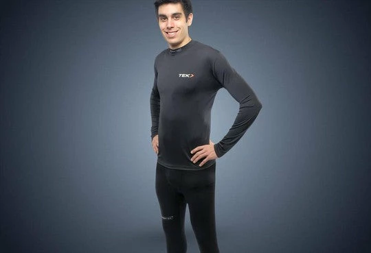 Black fitted shirt and pants (2-piece). Body-fit long sleeve top, 4 ways stretch compression. Machine washable and highly durable. 94% Polyester, 6% Spandex.