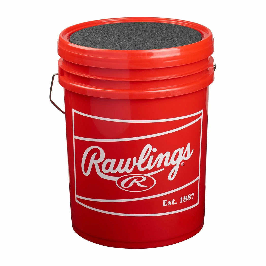 Rawlings durable bucket holds 4 dozen baseballs or 3 dozen softballs. This bucket features a snap-on lid with a cushioned seat that stays securely in place. Perfect for storing game or practice balls. Bucket sold with 24 65CC baseballs